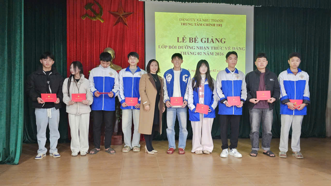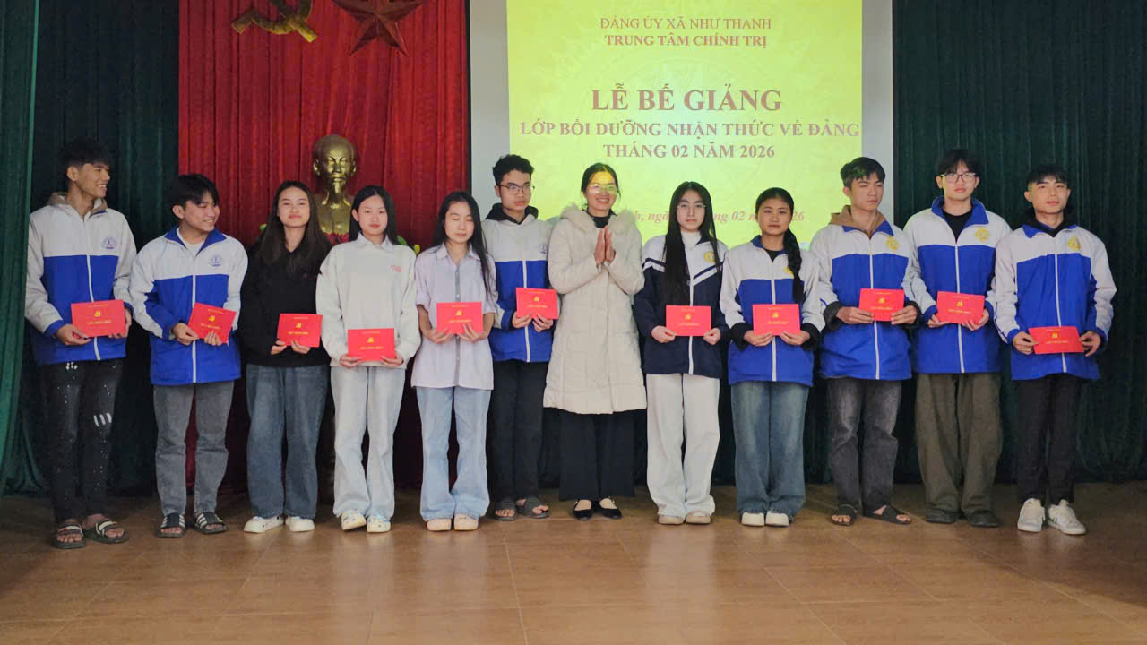 Chiều ngày 09/02/2026, Trung tâm Chính trị xã Như Thanh tổ chức Lễ bế giảng lớp bồi dưỡng nhận thức về Đảng năm 2026. Đây là dấu mốc quan trọng, ghi nhận quá trình rèn luyện phấn đấu của các học viên, những quần chúng ưu tú đang ấp ủ khát vọng được đứng trong hàng ngũ của Đảng.