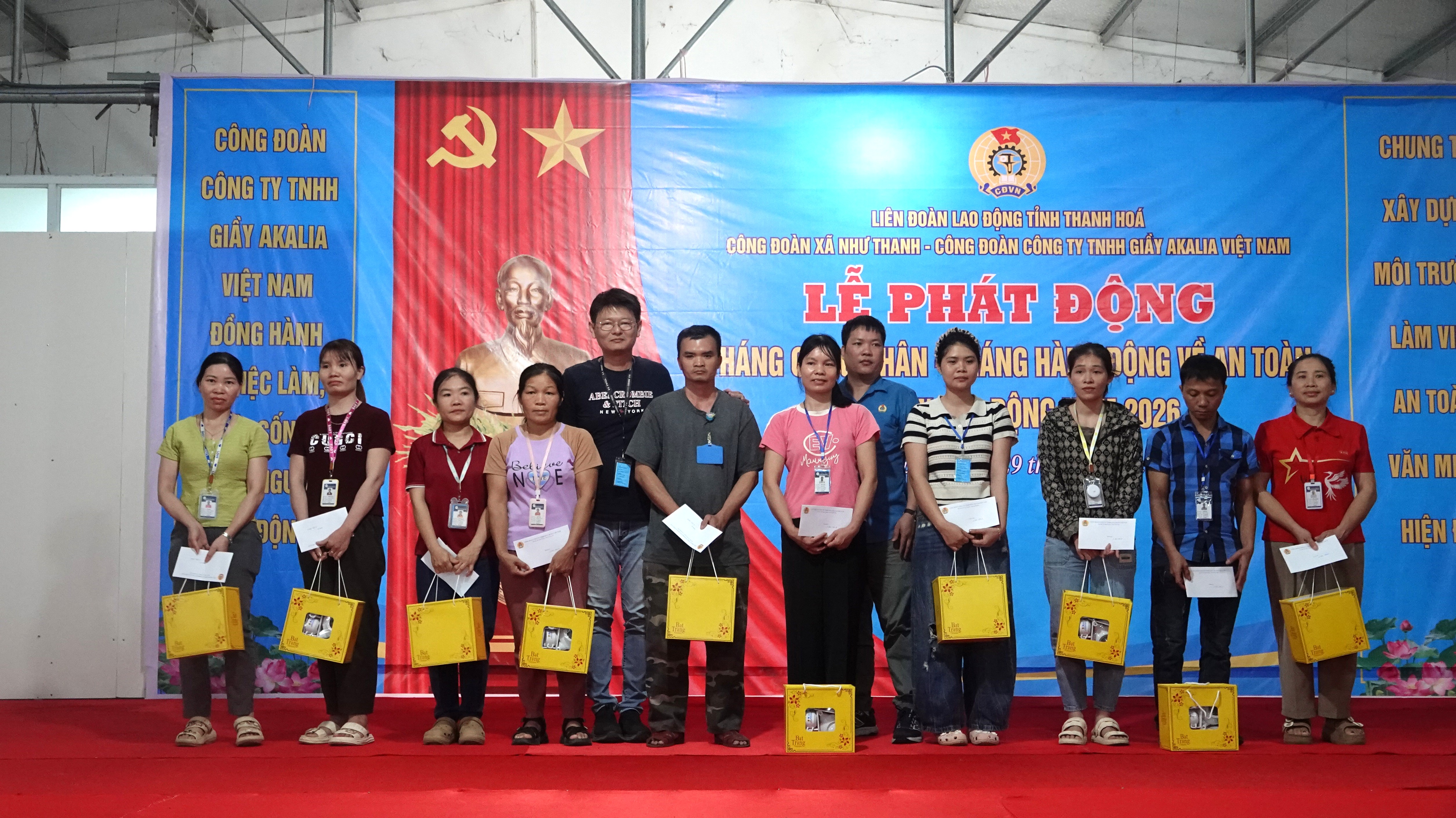 Tại lễ phát động, Ban Tổ chức đã trao 35 suất quà của Liên đoàn Lao động tỉnh cho đoàn viên có hoàn cảnh khó khăn, mắc bệnh hiểm nghèo. Nhân dịp này, Công ty TNHH Giầy Akalia Việt Nam cũng trao tặng 10 suất quà thường niên cho đoàn viên công đoàn có hoàn cảnh khó khăn, thể hiện sự quan tâm, chia sẻ và trách nhiệm của doanh nghiệp đối với người lao động, góp phần động viên đoàn viên yên tâm làm việc, gắn bó lâu dài với công ty.