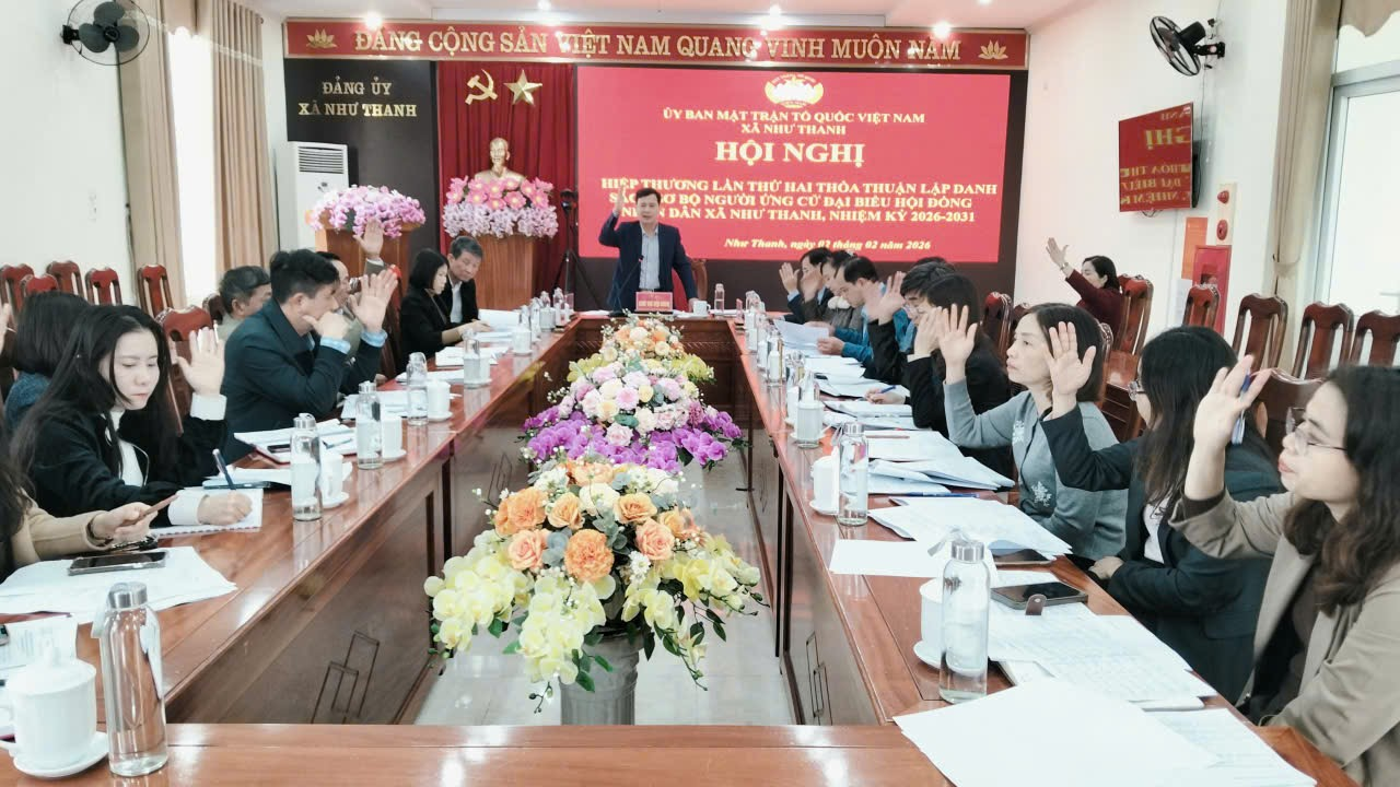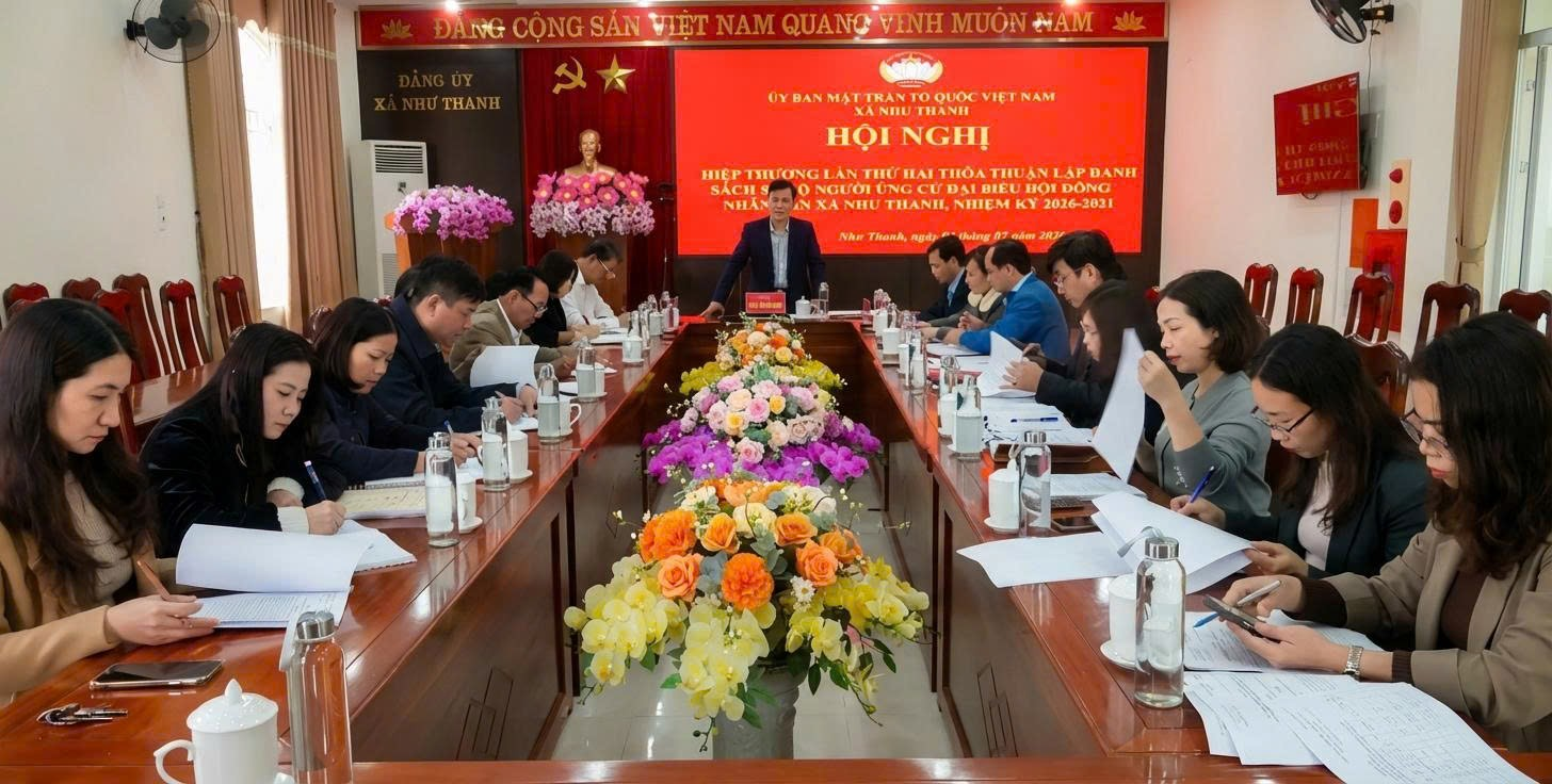 Thực hiện Điều 53, Điều 54 Luật Bầu cử đại biểu Quốc hội và đại biểu Hội đồng nhân dân năm 2025; căn cứ Kế hoạch tổ chức bầu cử đại biểu Quốc hội và Hội đồng nhân dân các cấp nhiệm kỳ 2026 – 2031, sáng ngày 02/02/2026, Ban Thường trực Ủy ban Mặt trận Tổ quốc Việt Nam xã Như Thanh tổ chức Hội nghị hiệp thương lần thứ hai để thỏa thuận lập danh sách sơ bộ người ứng cử đại biểu Hội đồng nhân dân xã Như Thanh, nhiệm kỳ 2026 – 2031.