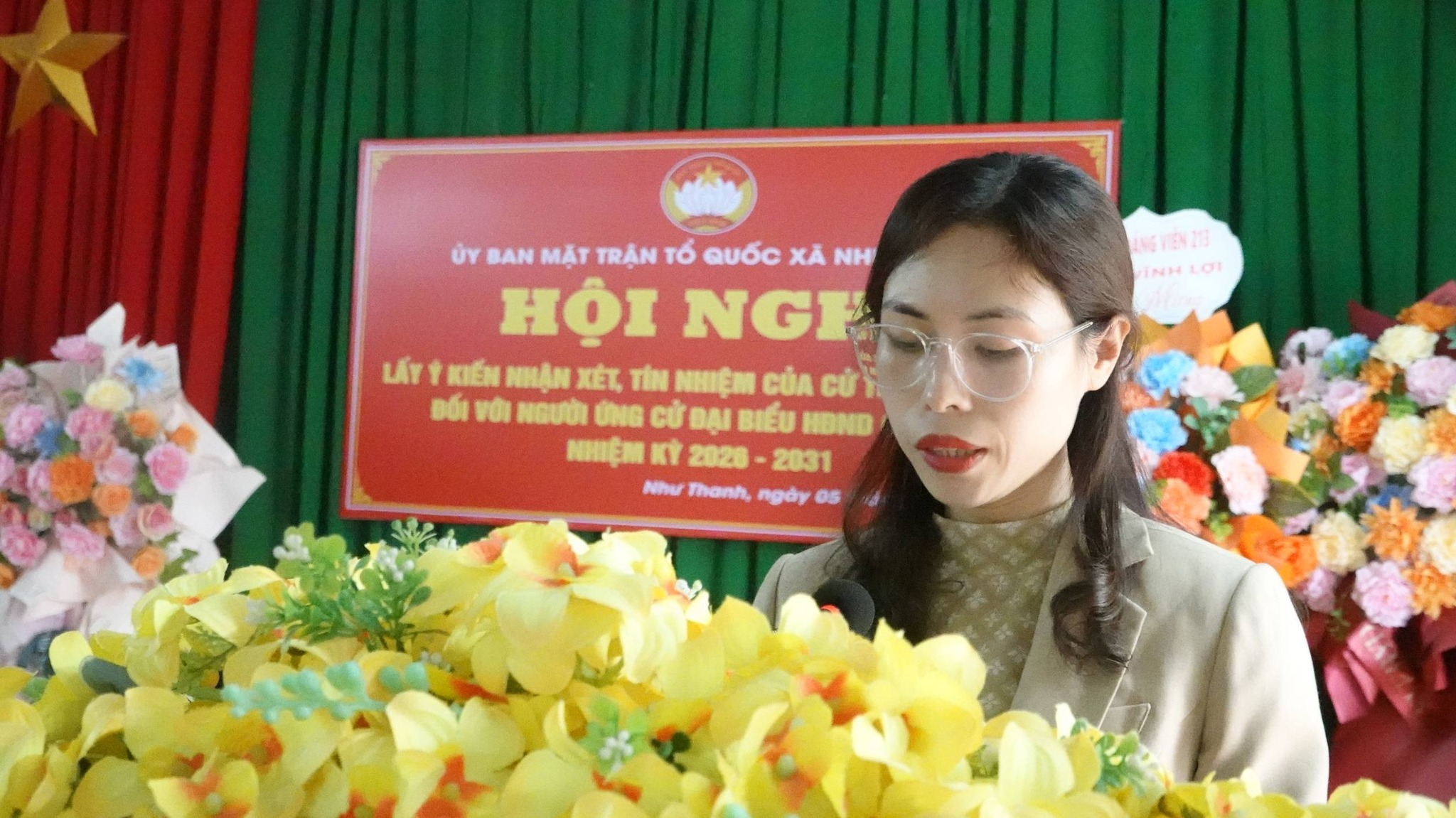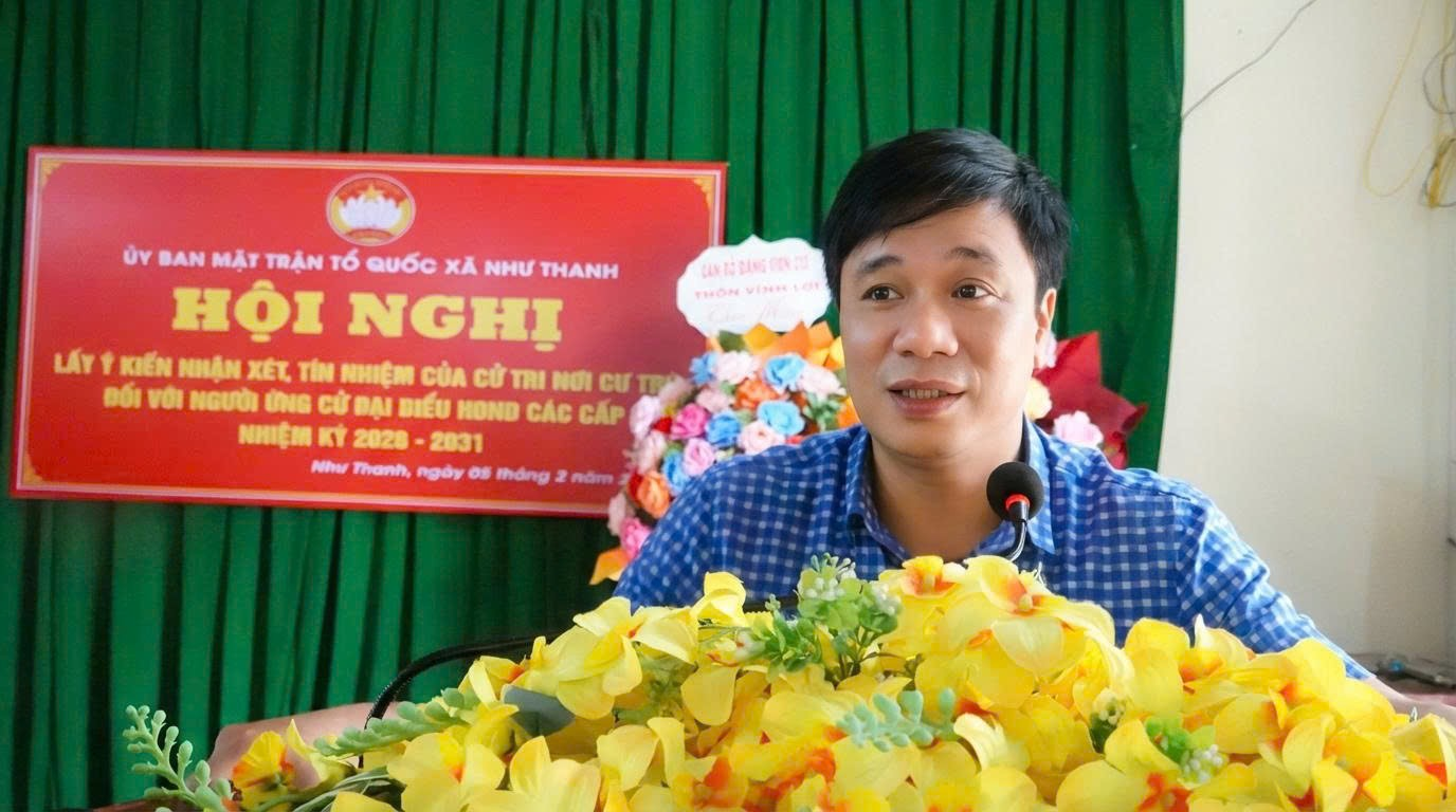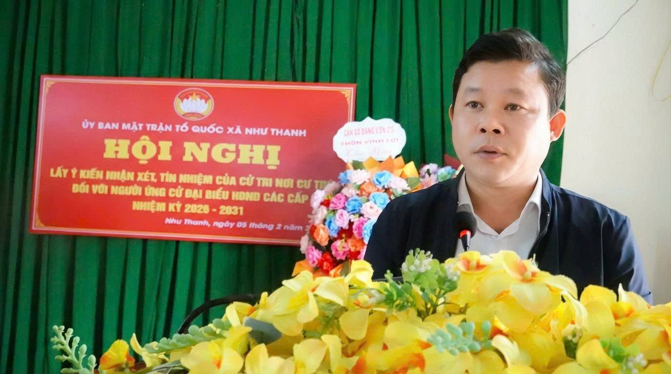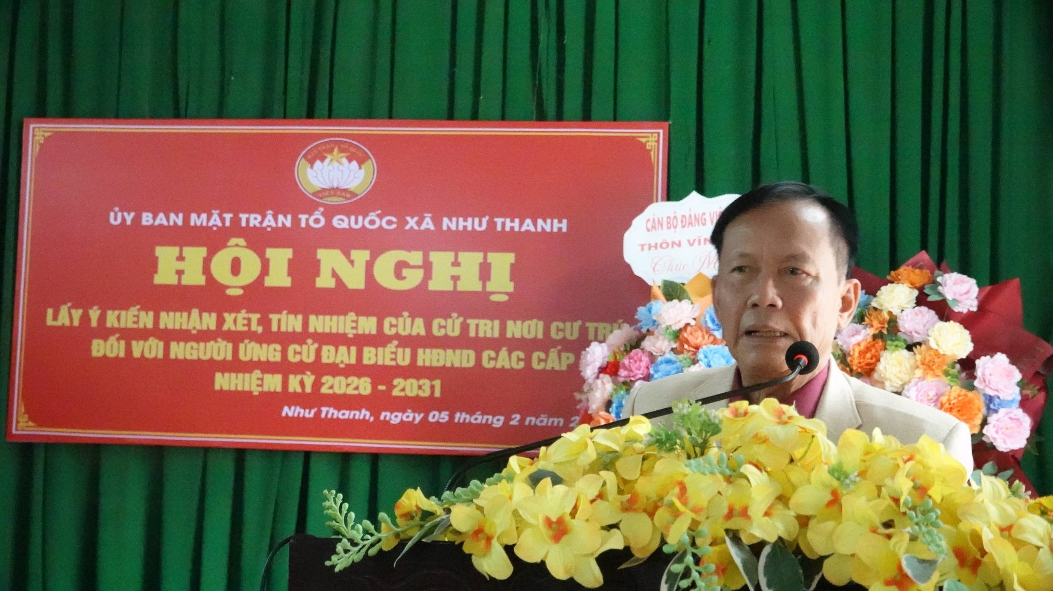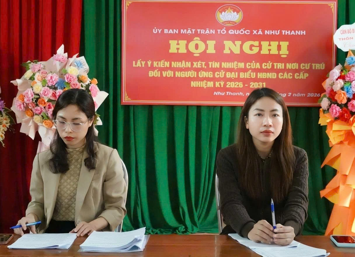 Tại hội nghị, cử tri đã tiến hành nhận xét, góp ý và bày tỏ sự tín nhiệm đối với các ông, bà được giới thiệu ứng cử đại biểu Hội đồng nhân dân các cấp, nhiệm kỳ 2026 – 2031, gồm: bà Trần Thị Kim Thoa, Ủy viên Ban Thường vụ Đảng ủy, Trưởng Ban Xây dựng Đảng xã Như Thanh; ông Nguyễn Trọng Hiếu, Ủy viên Ban Thường vụ Đảng ủy, Phó Chủ tịch Ủy ban nhân dân xã Mậu Lâm; ông Trương Văn Quỳnh, Ủy viên Ban Thường vụ Đảng ủy, Trưởng Công an xã Như Xuân; ông Lô Văn Hơn, Ban Chỉ huy Quân sự xã Như Thanh; ông Vũ Đình Vũ, Công an xã Mậu Lâm; và ông Quách Văn Nguyễn, Trưởng thôn Vĩnh Lợi.