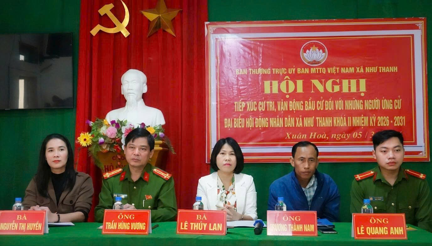 Sáng ngày 5/3/2026, tại Nhà văn hóa thôn Xuân Hoà, Ban Thường trực Ủy ban MTTQ Việt Nam xã Như Thanh tổ chức hội nghị tiếp xúc cử tri, vận động bầu cử đối với các ứng cử viên đại biểu HĐND xã khóa II, nhiệm kỳ 2026 – 2031, thuộc đơn vị bầu cử số 1.