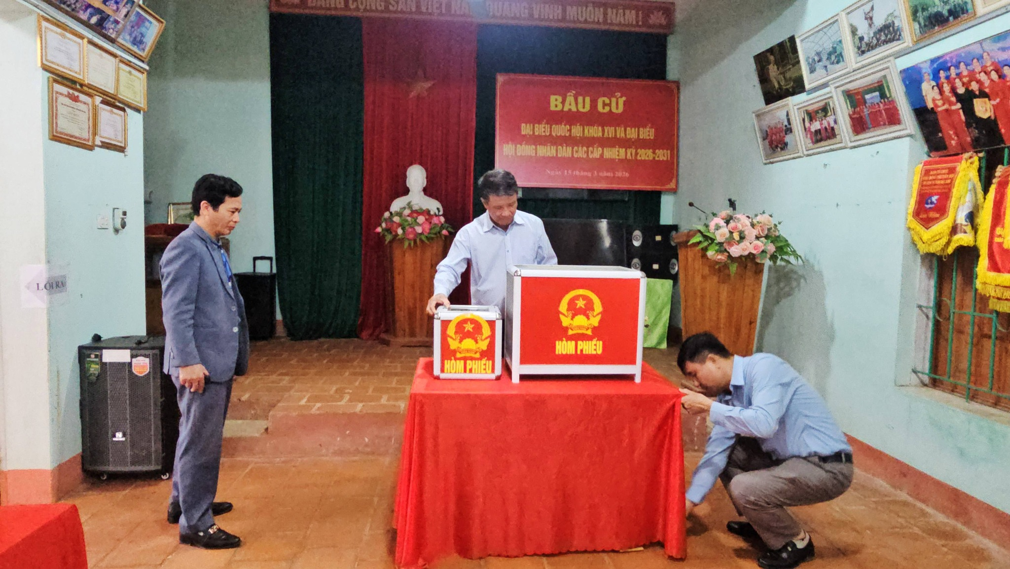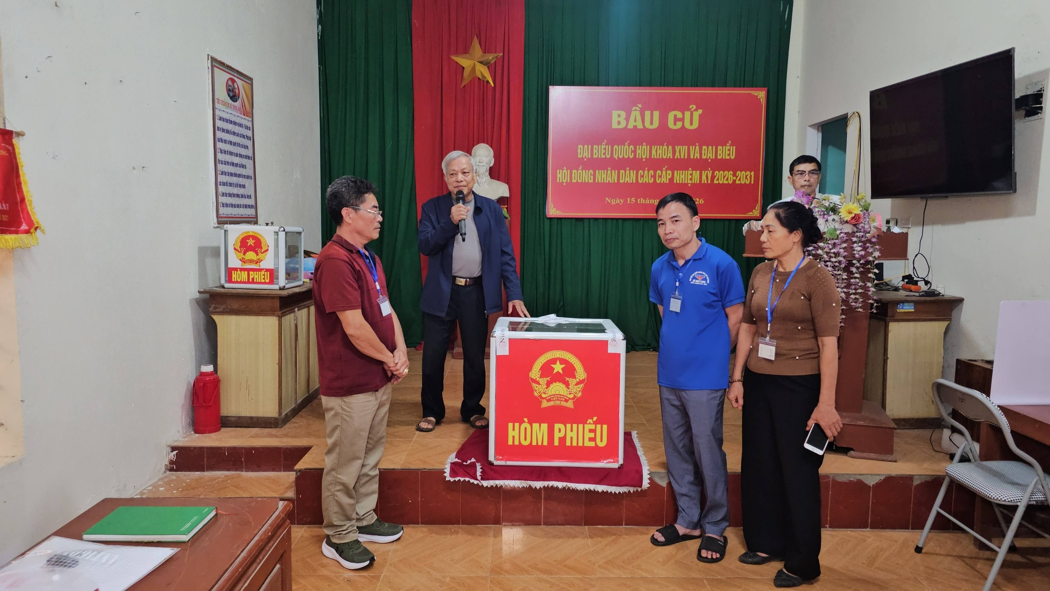 Tại các điểm bỏ phiếu – chủ yếu đặt tại nhà văn hóa các thôn – việc trang trí khánh tiết được thực hiện trang trọng, đúng quy định. Danh sách cử tri; danh sách và tiểu sử tóm tắt của những người ứng cử đại biểu Quốc hội khóa XVI, đại biểu HĐND các cấp được niêm yết đầy đủ, công khai, tạo điều kiện thuận lợi để cử tri tìm hiểu, nghiên cứu trước khi tham gia bỏ phiếu. Các khu vực hướng dẫn, bàn phát phiếu, nơi viết phiếu bầu, hòm phiếu và bàn đóng dấu “đã bỏ phiếu” được bố trí khoa học, hợp lý, bảo đảm thuận tiện để cử tri thực hiện quyền và nghĩa vụ công dân.